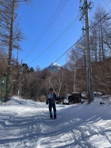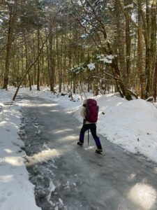 まずは赤岳山荘を目指して、ゆるやかな林道を進みます。 途中、流れる水が凍って天然のスケートリンクのようになっている場所も。 早々にアイゼンを装着した日浦さんが、軽快に進んでいく姿が印象的でした。