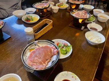 部屋に入ると、そこはまるでホテルのようなベッドのお部屋。 「ここは本当に山の中?」と驚くほど快適で、まずはみんなで乾杯🍻 夜ご飯まで少し時間があったので、アーベンロート(夕焼け)を見に外へ。 「赤岳鉱泉といえばステーキだよね」と話していたら、 なんと本当に夜ご飯がステーキ! 山の上でいただくとは思えないほど美味しく、贅沢な時間でした。