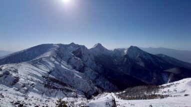 夜も暖かく、ぐっすりと眠ることができました。 2日目 翌朝は6時起床。朝食もとても豪華! 7時15分に小屋を出発。 この日も快晴、風もほとんどなく最高のコンディション。 稜線に出る前にアウターシェルやゴーグル、手袋を装着し、いざ稜線へ。 稜線でも風はないのでは、、と思いましたが、稜線はやはり風が強い! それでも景色はとても綺麗で赤岳や阿弥陀岳がかっこよくみえました!