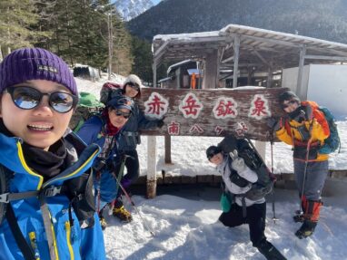阿弥陀岳を背景にした浅田さんを見て、「阿弥陀としお…?」と、なぜかペンネームのような名前を武鹿さんがひらめき、下山まで阿弥陀としおのくだりを1人で思い出しては1人で笑って楽しんでました🤭 14時ごろ、赤岳鉱泉に到着。 大同心、赤岳、阿弥陀岳を一望できる最高の天気でした! 赤岳鉱泉では、名物のアイスキャンディーでアイスクライミングの練習が行われていました。 初めて見るアイスクライミングは迫力満点で、いつかやってみたい!! 次はアイスキャンディー目的で行くいう新たな目標もできました。