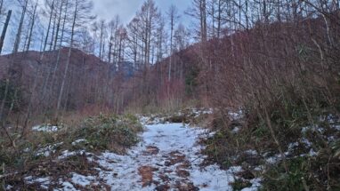 最初は緩やかな登りの林道からスタート。ここ最近の暖かさで雪は解けていました。