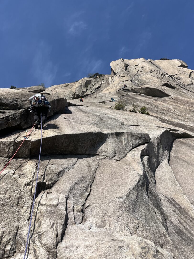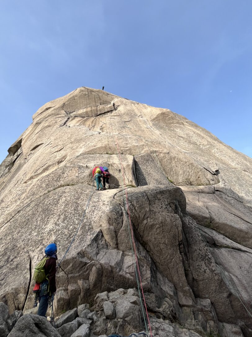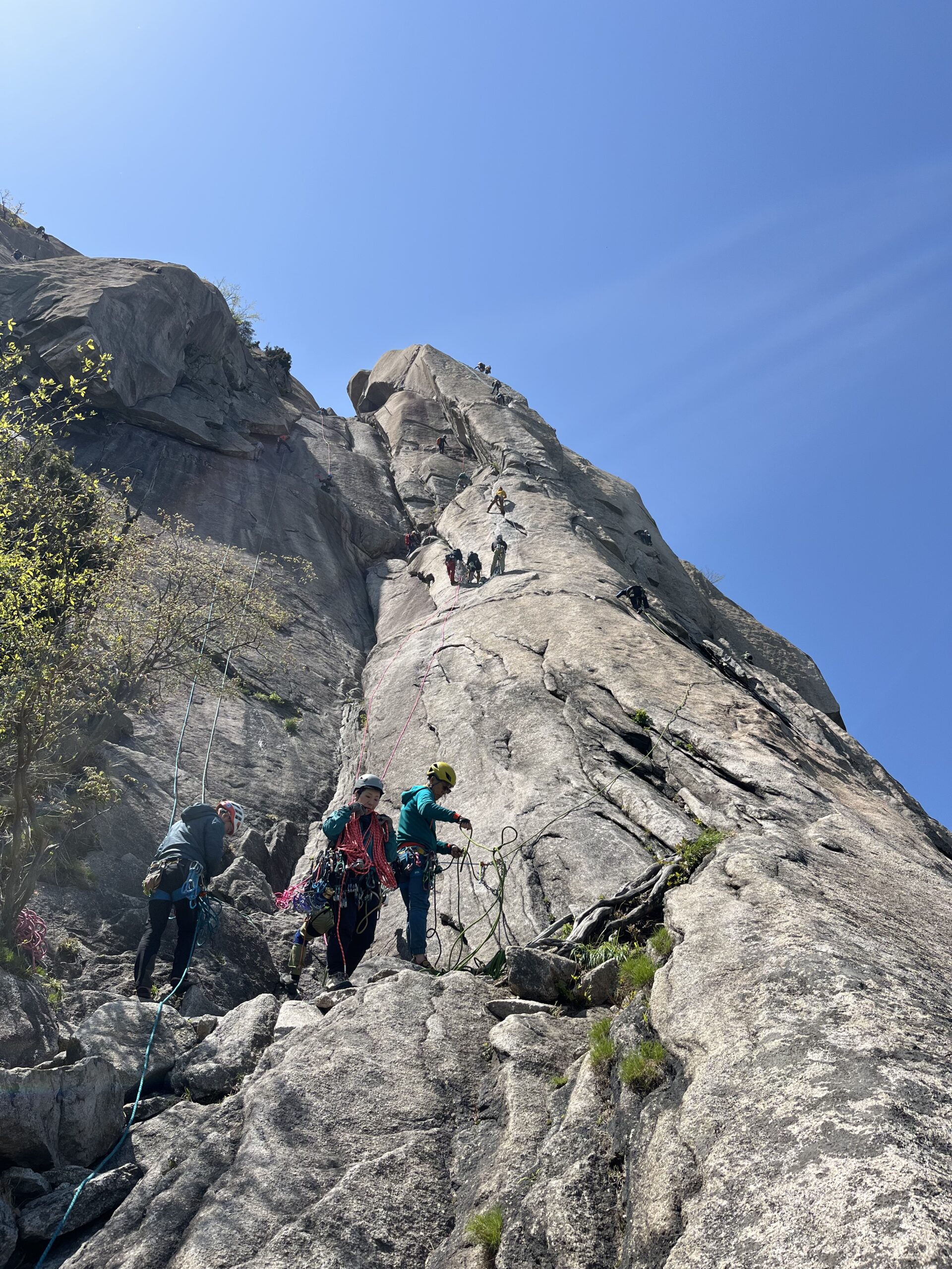 地元クライマー達は、シングルロープを繋げて数珠繋ぎに登っていく。