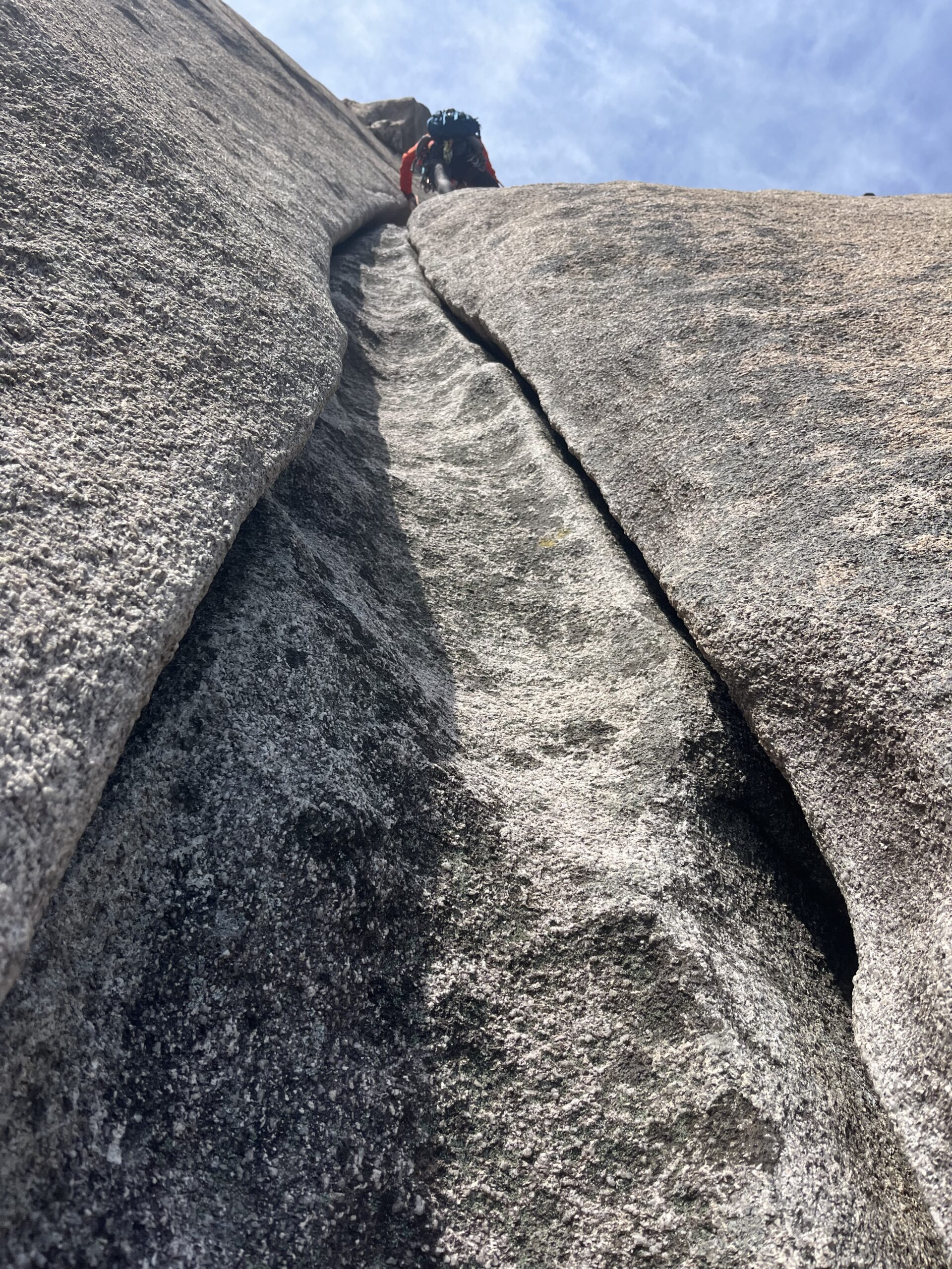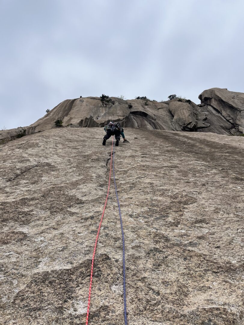 途中からクラックが途切れて純粋なスラブ登りとなる。