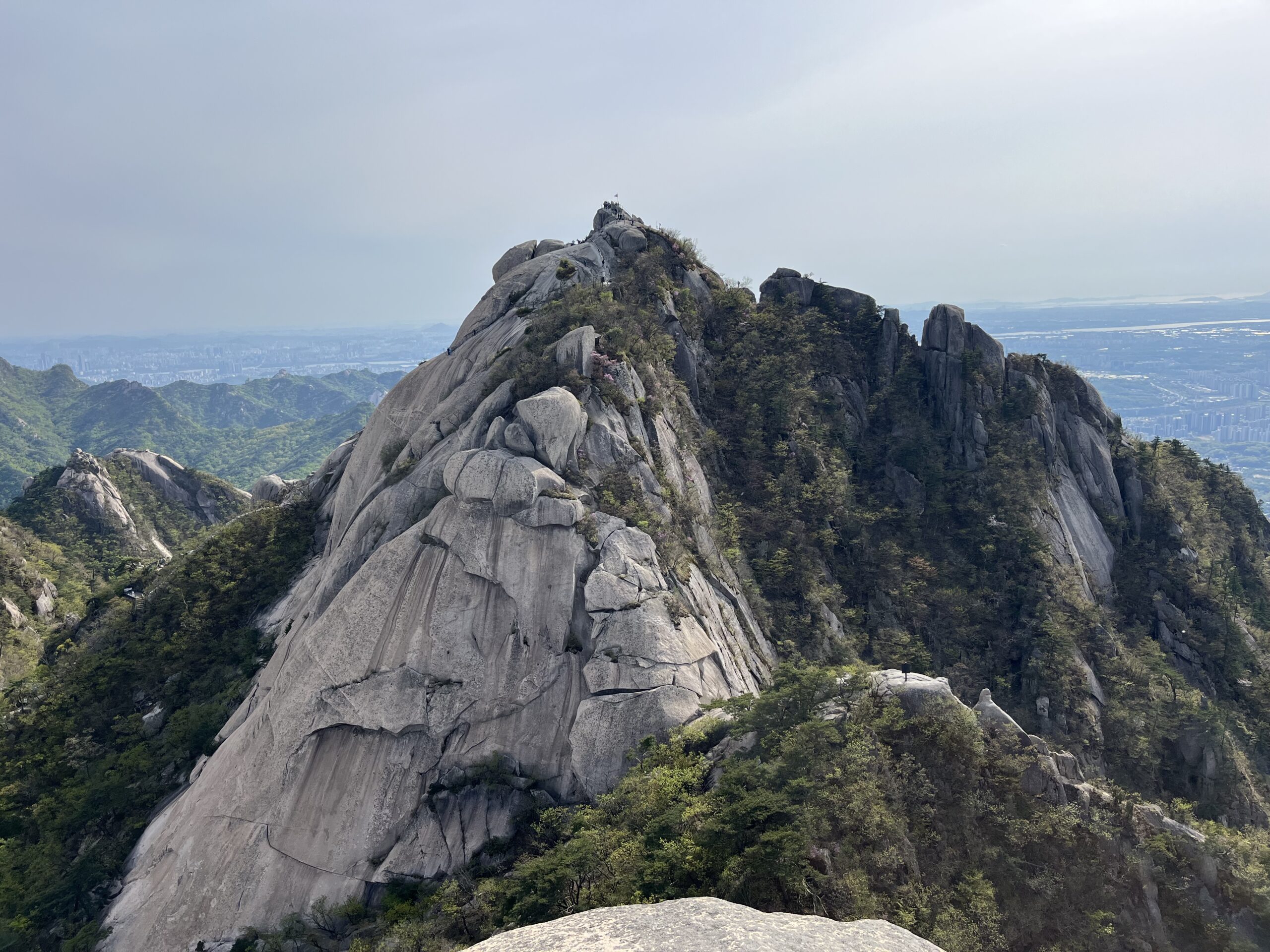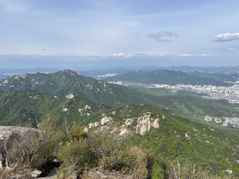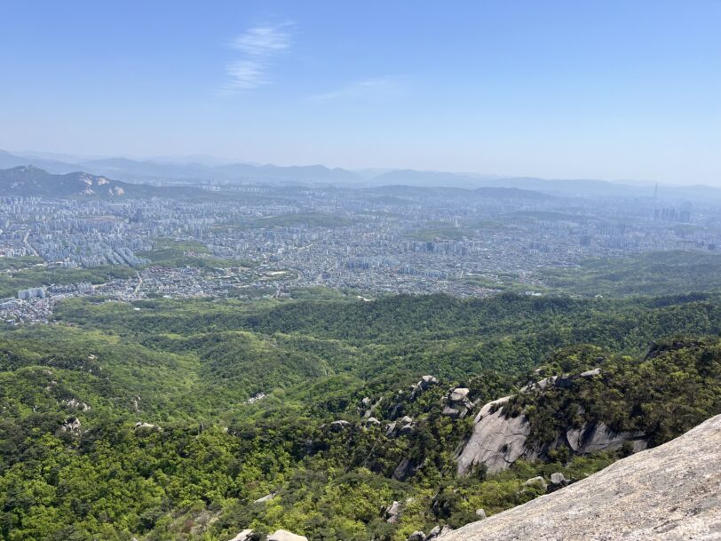 目に飛び込んでくるのはソウルの街並みとハイカーで賑わう白雲台、北西を見ると海だろうか?天気が良く、遠くの山並みが見渡せる。