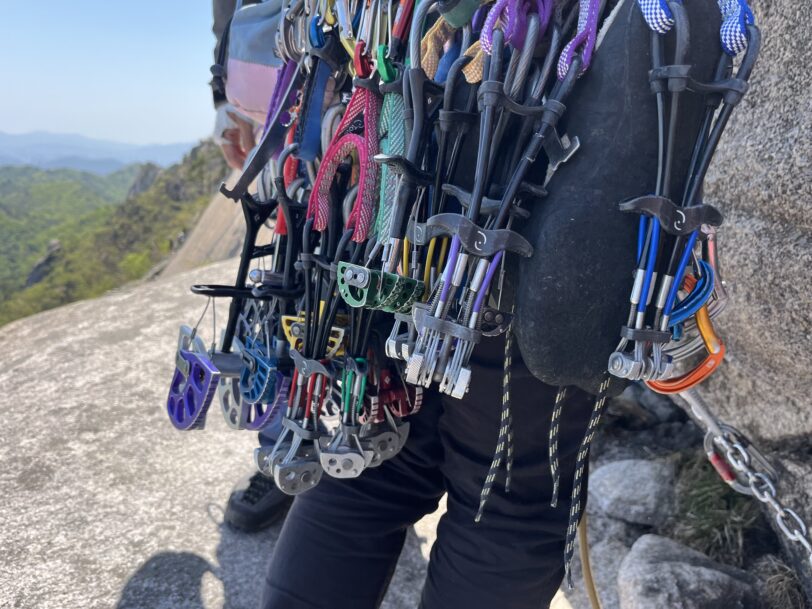 ダブルロープ50m×2、カム(トーテム黒~キャメロット4番×2セット、キャメロット5番)、ヌンチャク15本程度(アルヌン含む)、長めの捨て縄、アブミ×2 とかとか