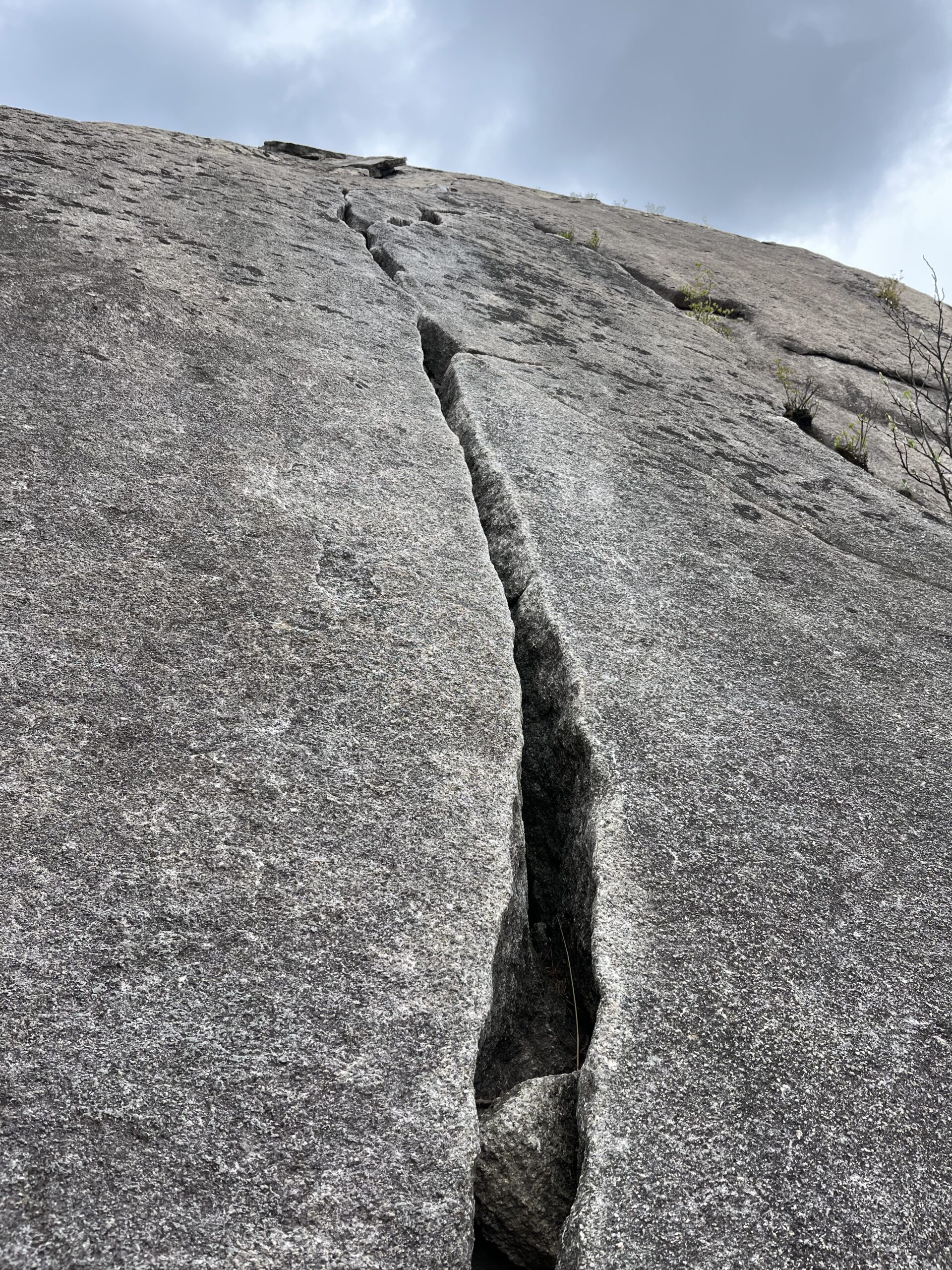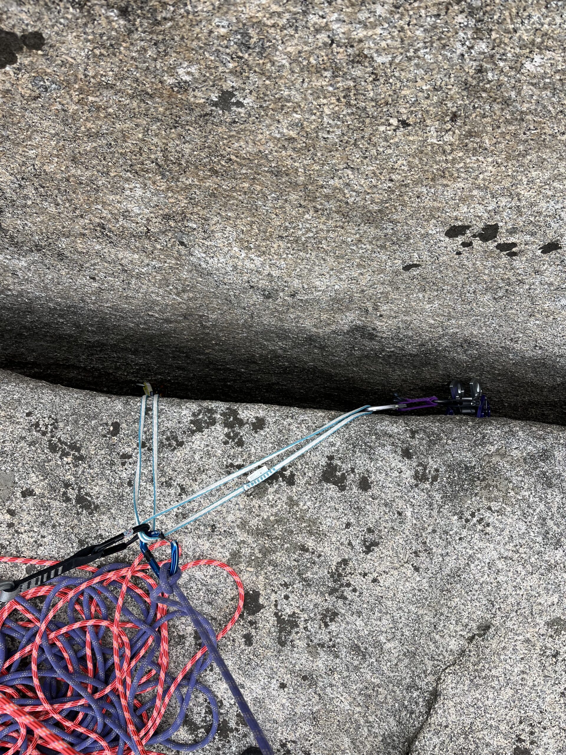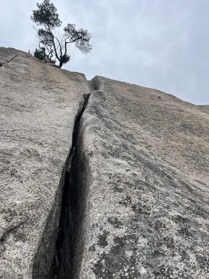 左側のクラックを使いながらのスラブを登る。クラックは広めだが、徐々に狭くなる。