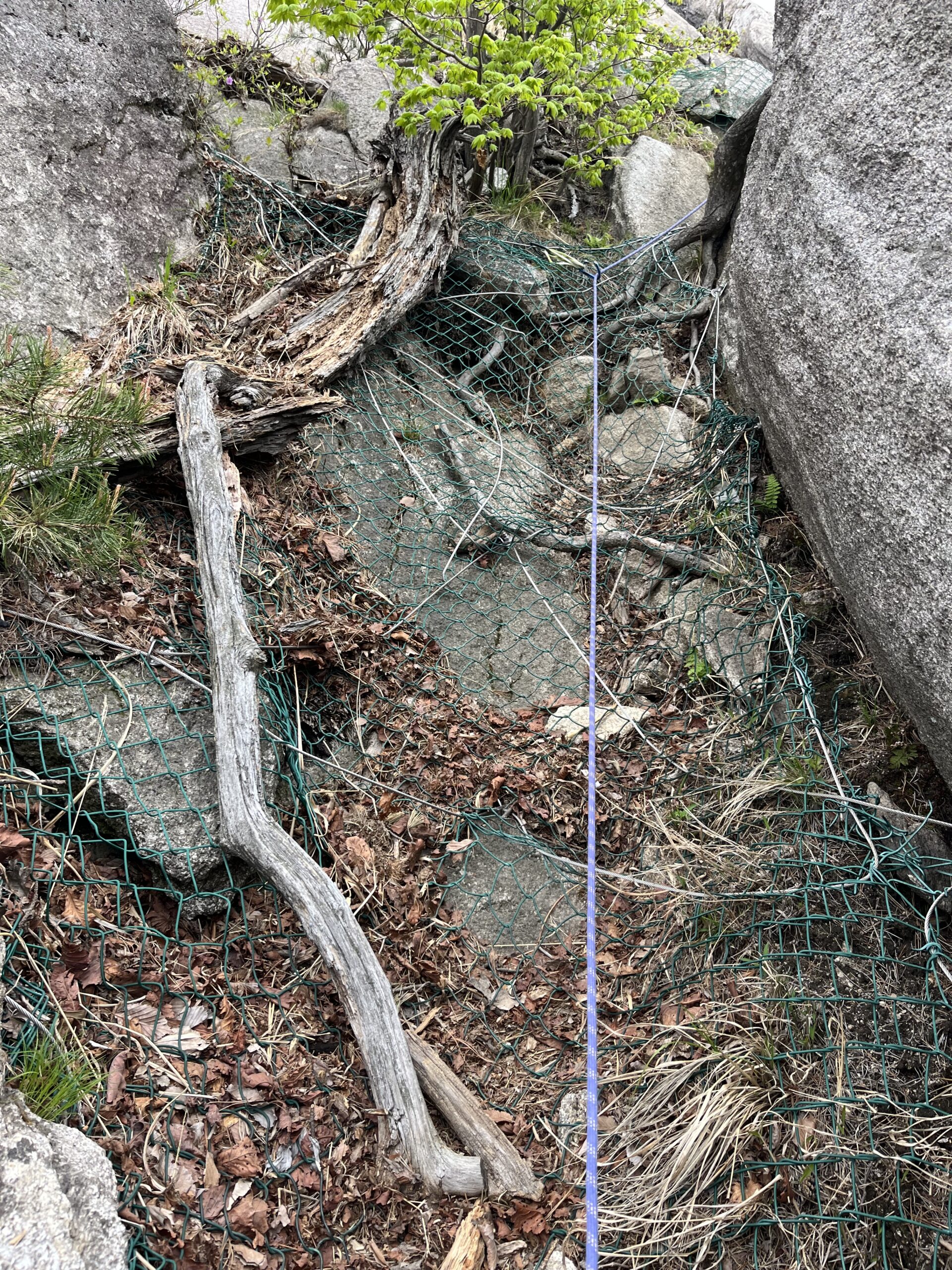 さらに進むと分岐があり右に進む。左に進むと東面下部スラブの取りつきに行ける。FIXロープの張られた岩をこえると、東面右側の基部に着く。(8:30)
