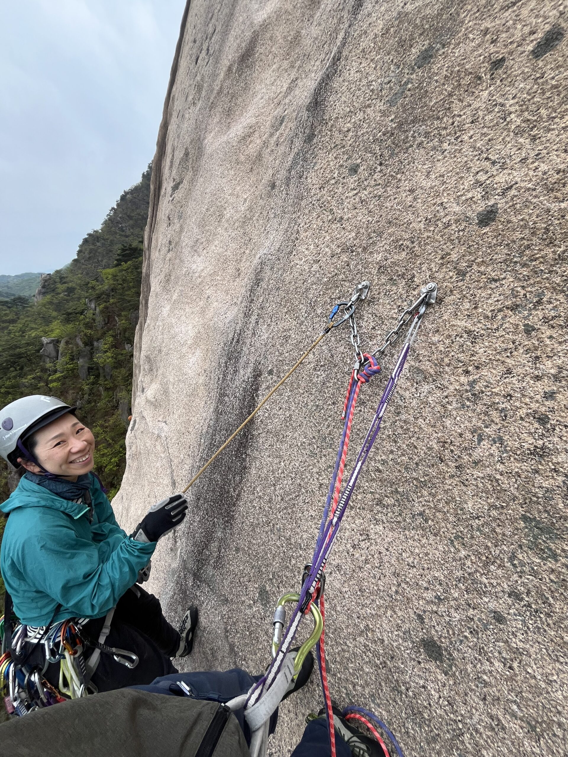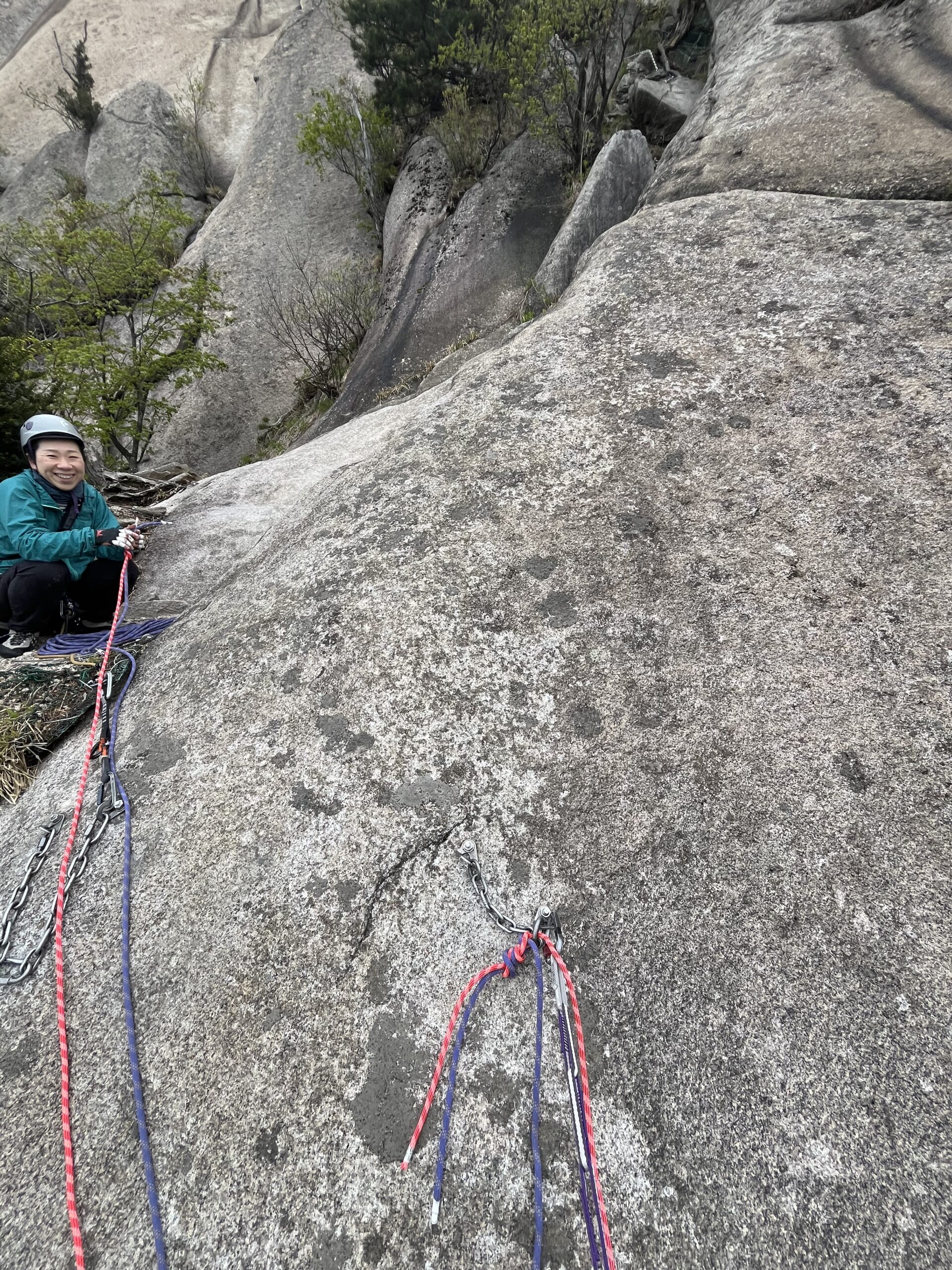 私の困った顔を見かねてか、翻訳アプリを使い「ロープを使っていいよ。70mだから1回で降りれる」とありがたい提案!遠慮なく使わせてもらう。