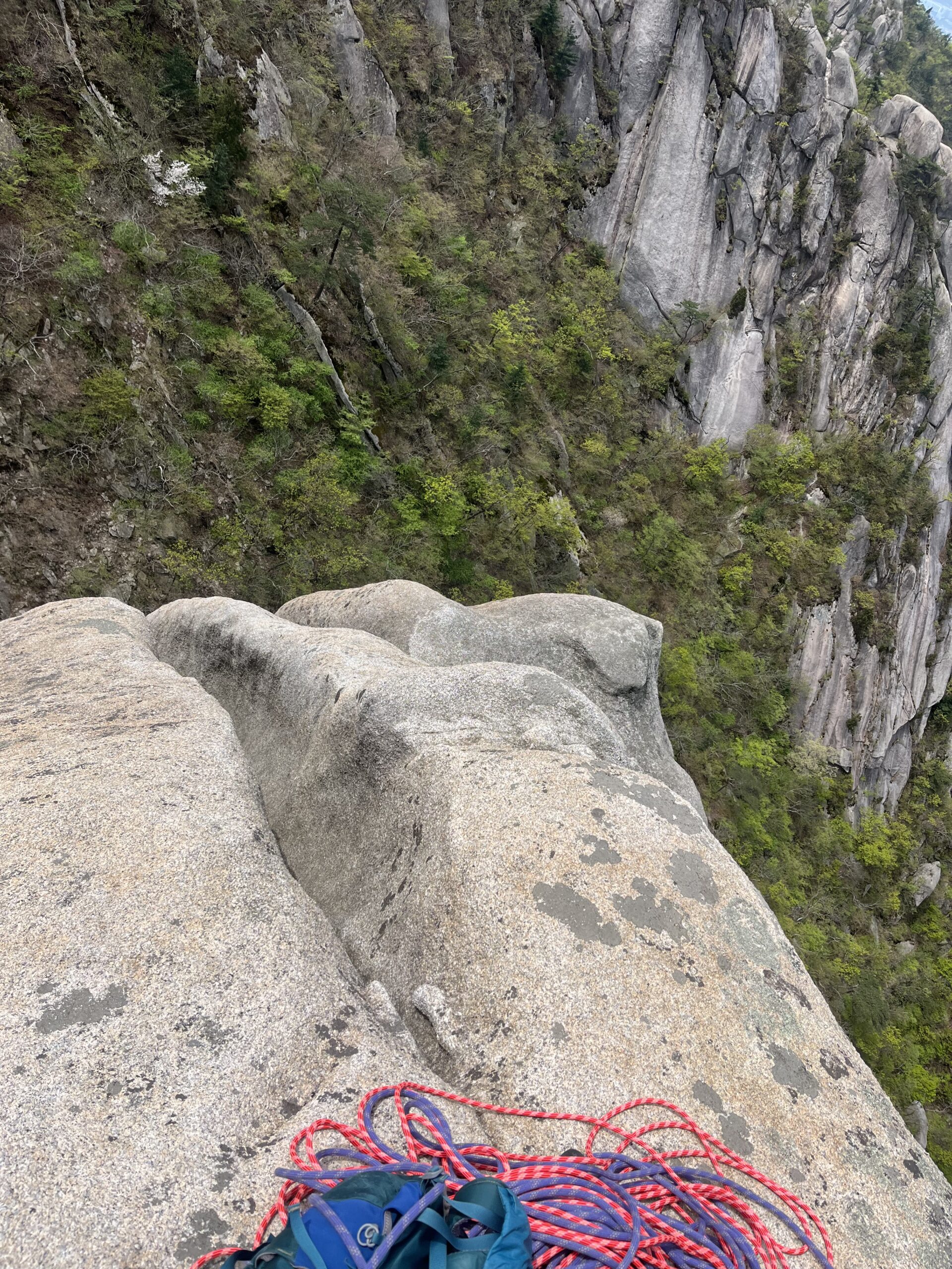 最初に地元クライマーが1人降り、続いて私の番。障害物のない70mの懸垂下降。
