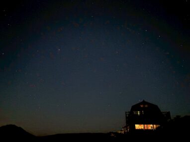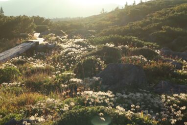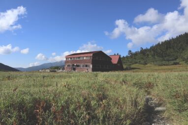 森を抜けるとアラスカ庭園。太陽が真上にあり、じりじりと照りつけてきます。標高が高いのに、真夏のような暑さ。布で全身を覆いながら対策!そしたら草原の中にぽつんと立つ小屋を発見!