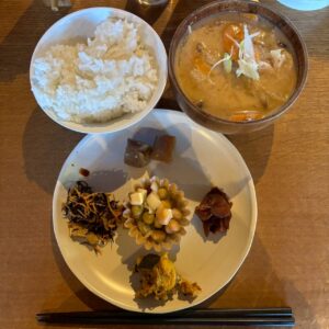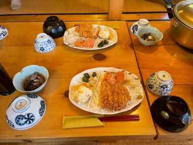 かわいい小屋に到着。夕食はとんかつ!サクサクで白米も味噌汁も絶品。ご飯と味噌汁を2.5杯もいただきました。食後は満ち足りた気持ちでぐっすり眠れました。