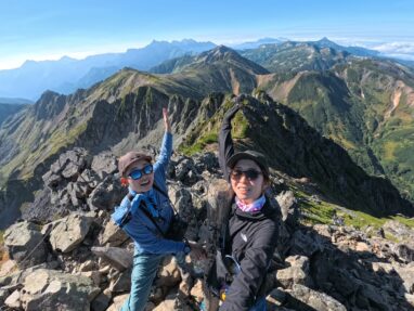荷物をデポして水晶岳へ。岩場が多く緊張しながらも30分ほどで山頂へ到着。景色は圧巻で、疲れも吹き飛ぶ!
