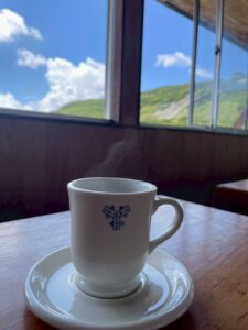 雲ノ平山荘で財布を落としたらしく一緒に探してた方と再会(見つかったらしい)。感謝の言葉とともにコーヒーをごちそうに(結局私たちは見つけられずだったのに、ありがとうございました)三俣山荘のサイフォンコーヒーはとても美味しく、窓からの景色もよくて至福のひととき。