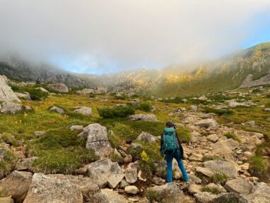 まだ暗く、熊の気配に怯えながら黒部五郎岳へ。途中で新しい足跡や糞を見つけてさらに焦る、、。黒部五郎カールへ到着。紅葉が始まってる?黄色と緑、岩肌のコントラストがとてもきれいだった!
