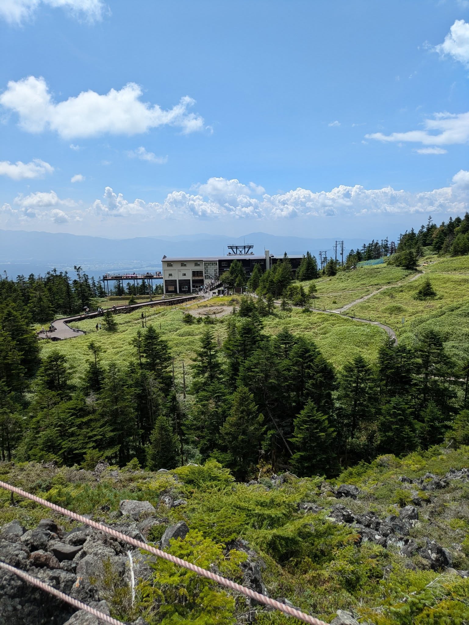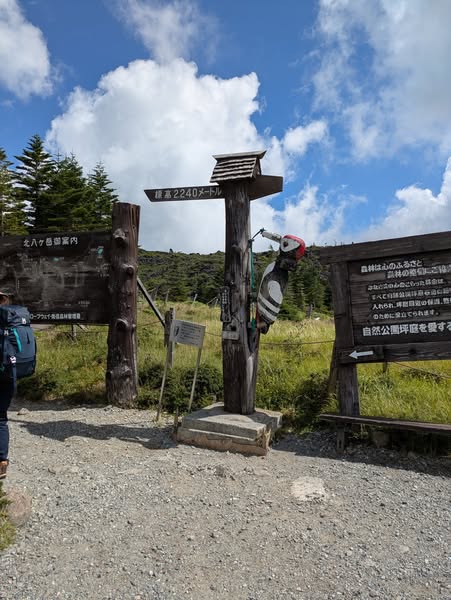 北横岳ヒュッテを経由して1時間半ほどで山頂に着く。冬に来た時は南、北、中央とアルプスが見えてが、今回はあいにくアルプスは雲の中でした。