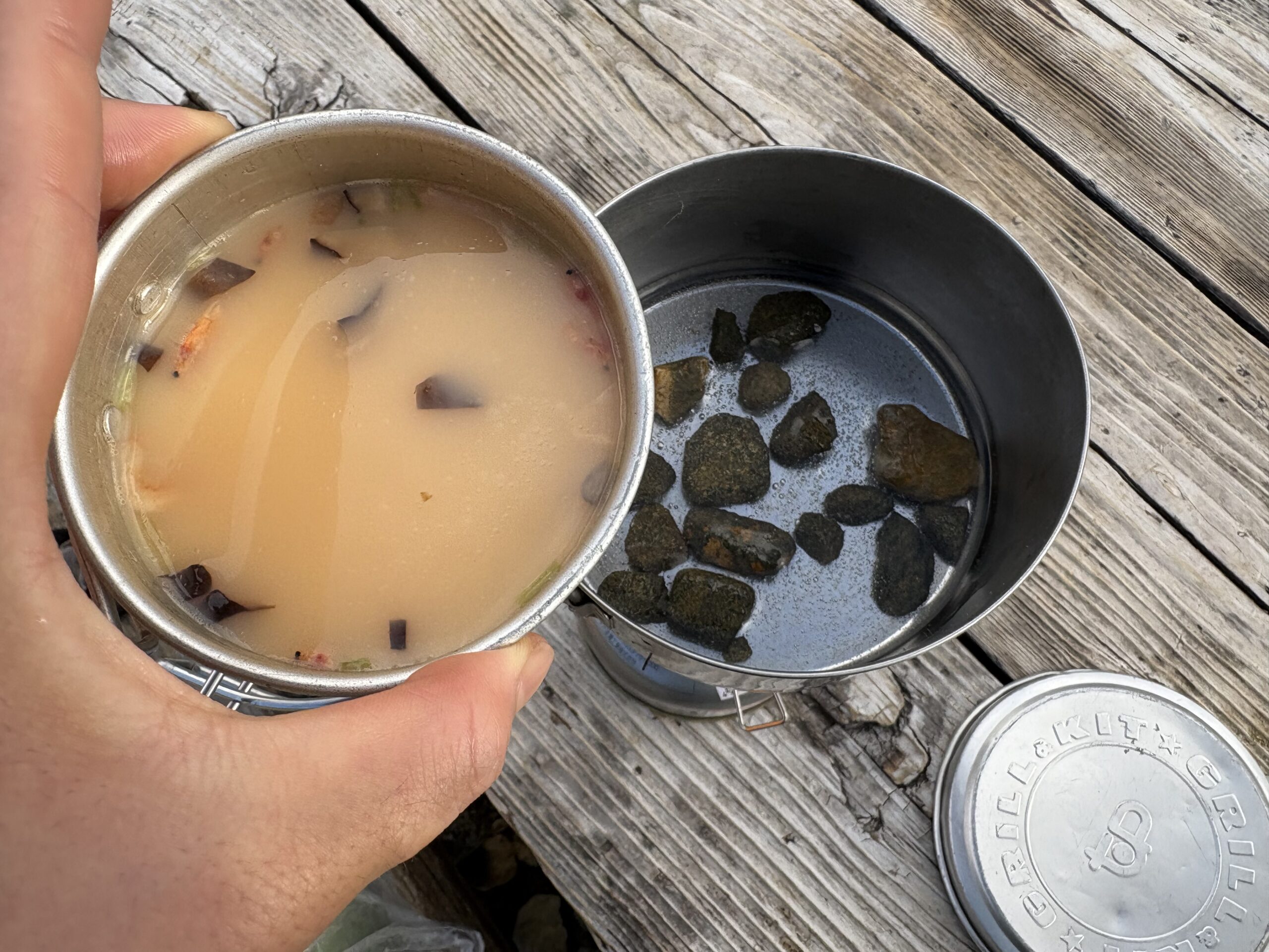 そのへんに転がってる石をコッヘルに詰めて…ジャッジャジャーン、蒸し器完成!これは使える!