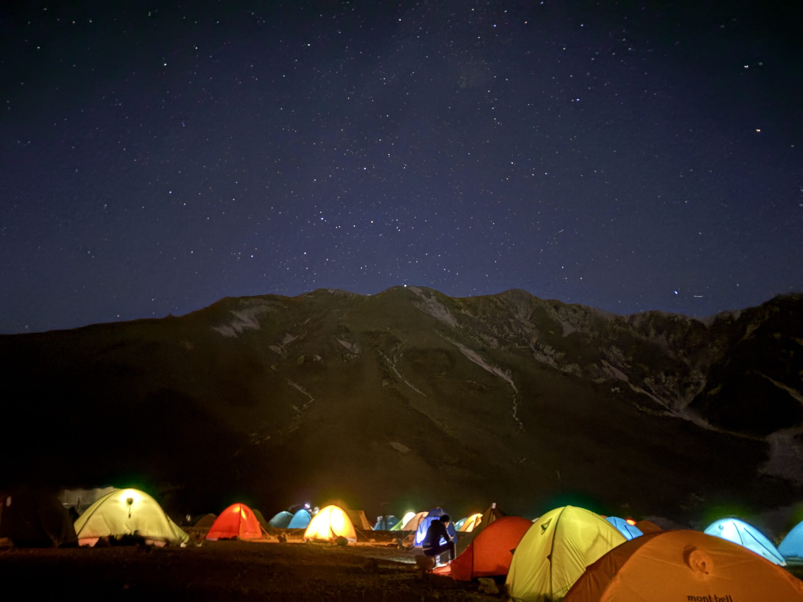 剣岳の西面が見たくて奥大日岳へ行きたいと思っていたら、岡本さんが剣岳は厳しいと言うので雷鳥沢テント泊で奥大日岳を企画したら行きたいとの事で計画した。河合君の剣隊に便乗して室堂へ、時間余裕があるので河合君、後藤さんも奥大日岳へ同行となった。山頂で別れて雷鳥沢へ下り、岡本さん特性の芋煮鍋、茶碗蒸しを頂く。最高に美味しい山ご飯である。満天の星空を眺めながら至福の時を過ごした。心使いゆりちゃんありがとう。