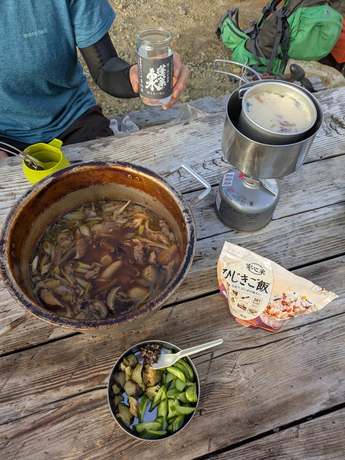今回、丁度いいコッヘルがなく、普段使っている鍋を持って行くことにしました。ザックの中には入らないので外付け。