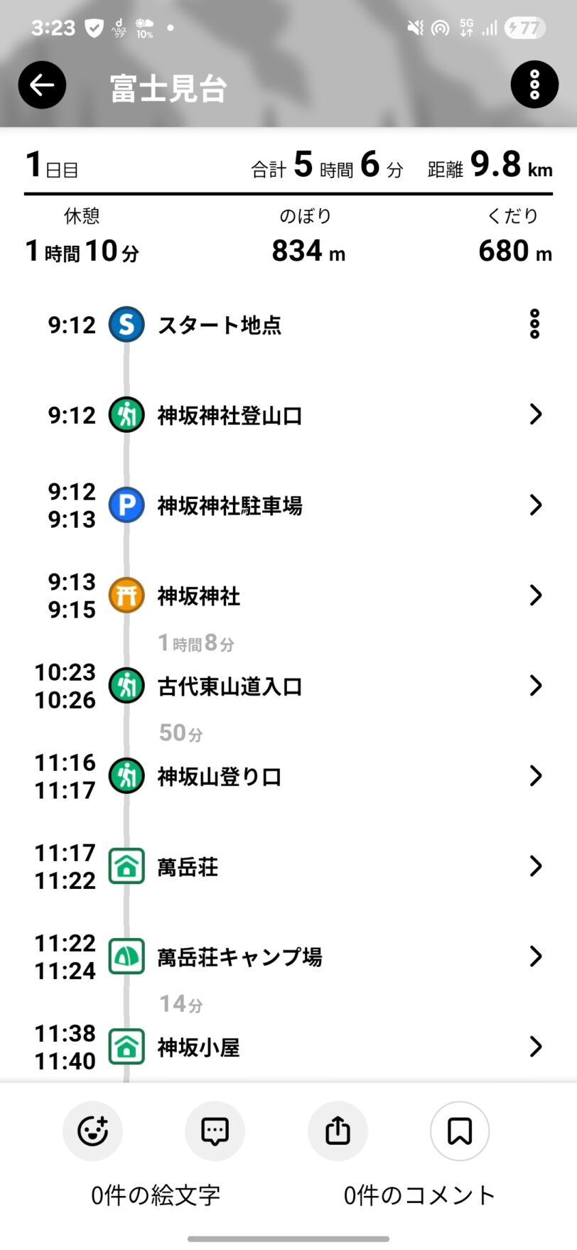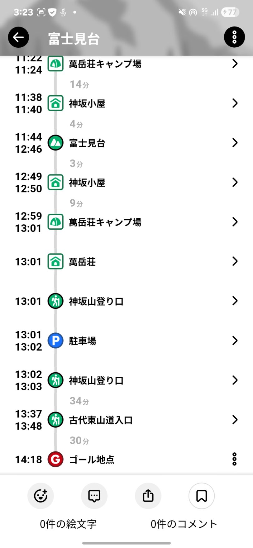 12:45富士見台を出発し、駐車場には14:20ごろ到着した。