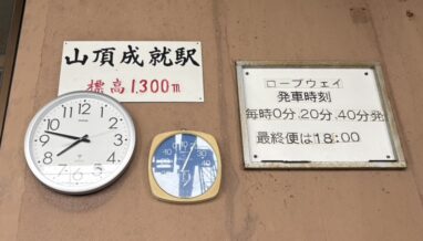 所要時間8分ほどで山頂成就駅に到着。天気は曇り。気温は20度。見渡す限りガスっていて肌寒い。雨予報ではないので山頂での晴れを期待する。