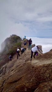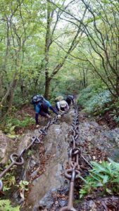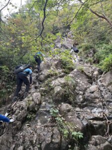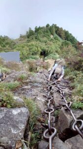 梅田さんを先頭に、クライミングはお手のもの岡本さん、高所へちゃらな小寺さん、スポーツ万能な青竹さん、みんな躊躇することなく慣れた動きで登っていく、流石です。最後尾にへっぽこな私が続く。朝露のせいか、鎖が濡れていて冷たくあまり気持ちよくない。足が置ける石をみつけ、タオルで手をふきふき鎖の輪の部分をしっかり握って、ガシガシ登ってゆきます。