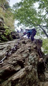 岩登りがおなかいっぱいになりかけたころに最後の難所が現れました。ほぼ垂直に近い噂どおりの急斜面にちょっとビビりました。先の方たちがかなり苦戦していて渋滞気味になっている。万が一落ちてこられたら自分たちも巻き添えになるなと、急に変な恐怖感にとらわれる。恐る恐る三角形の鎖に足をかけてみたが、わりと安定している。足の置き難い箇所はこの三角の鎖に頼る。