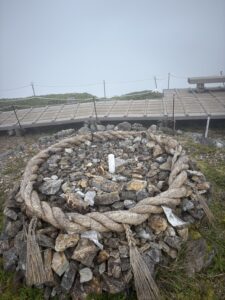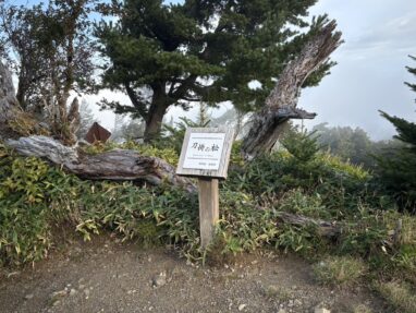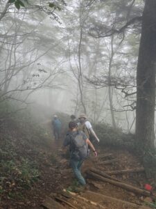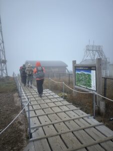 こちらの剣山を太郎、この先向かう次郎笈を次郎と呼び、兄弟峰と称するそうだ。山頂はガスガスで風がありひんやりしてきたので、皆でジャケットを羽織る。ほぼ視界はなかったがここから次郎笈まで続く稜線が見どころなので、どこかでガスが取れることを期待しながら歩き始める。