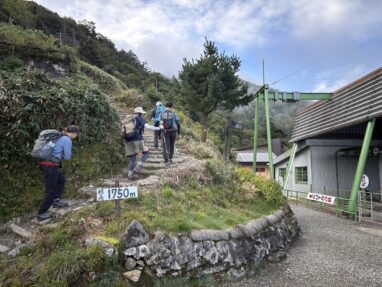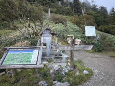 先に到着していた8名ほどのパーティは、香川県からみえた登山教室のOBの方々。交わした会話の中で、本日の目的は次郎笈を下ったところにある「奥槍戸山の家」で名物のカレーライスを食べるとのこと。後日、梅田さんが調べてくれたら、確かに剣山スーパー林道の剣山トンネル近くに山の家がありました。いつか鮮やかな紅葉の時期に訪れて剣山頂上ヒュッテで1泊し、登山と参拝、星空、ご来光を堪能し翌日次郎笈へ続く稜線を歩き、下って奥槍戸山の家でカレーを食す…というのんびり山行もいいかも。