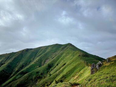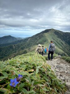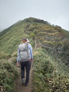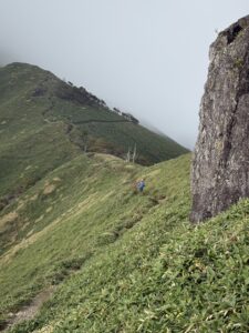 一方、剣山(標高1,955m)から次郎笈(標高1,929m)への稜線歩きはまさに天空の稜線トレイル。晴天なら最高でしたがあいにくの曇天。でも時折みえる山頂へと続く縦走路にワクワクしながら歩くのもまた楽しでした。