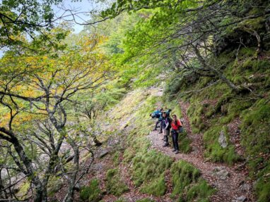 ブナの原生林のなかはしっとりとした空気。看板に「登山者の心得 挨拶は「おのぼりさん」「おくだりさん」と声をかけあいましょう」なんだか愛嬌あるかけ言葉です。