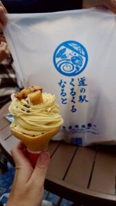 「道の駅くるくるなると」地元グルメやスイーツあり。地域の特産物(鳴門金時・レンコン・すだち等)やお土産品が満載なのでオススメです!とっても活気があって賑やかな道の駅でした。鳴門金時のソフトクリーム。