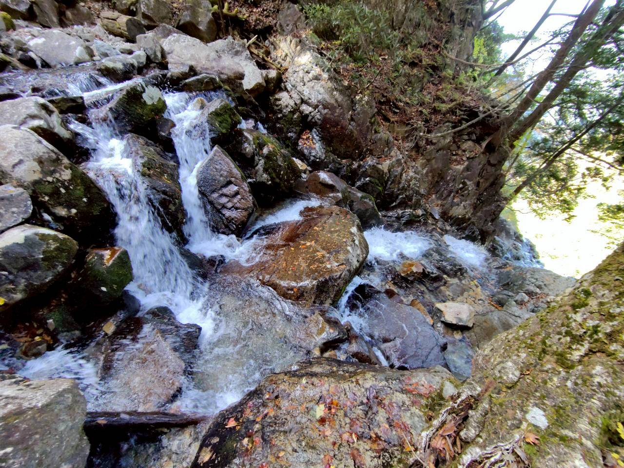 ここから右岸の斜面の急登、雄滝の落ち口を横断して左岸を更に急登を進むと樹林の中の岩尾根の急登。