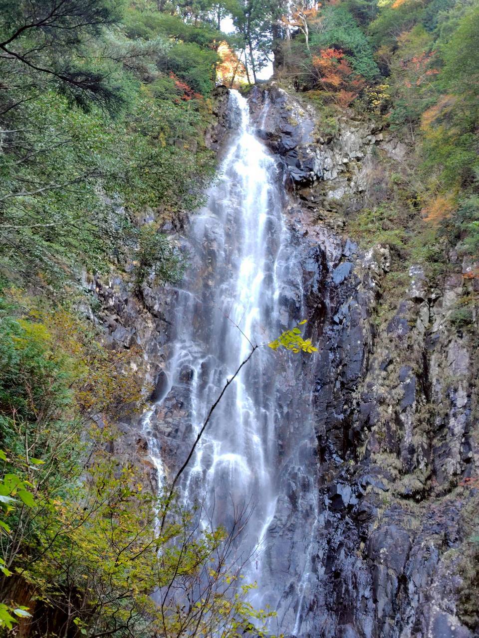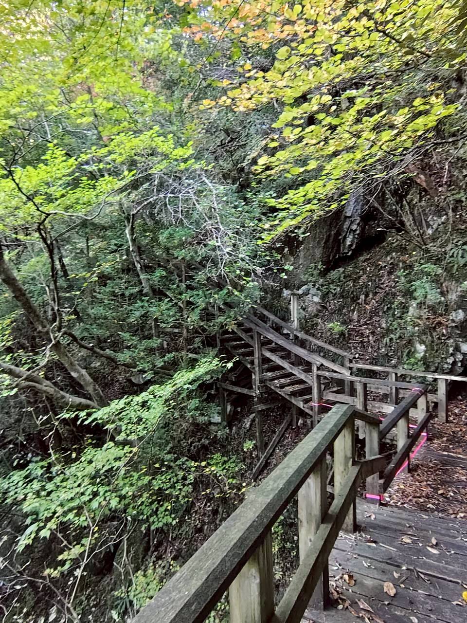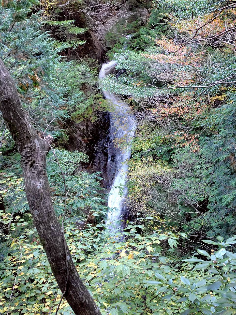 10月29日朝6時に岡崎集合で、乙女渓谷キャンプ場から二ノ谷コースに入る。歩きやすい木道・階段を進むとねじれの滝、和合の滝などのきれいな渓谷。熊出没が続く中、私が先頭で大きな鈴をつけ、時折ホイッスルを吹きながら、警戒して進みます。