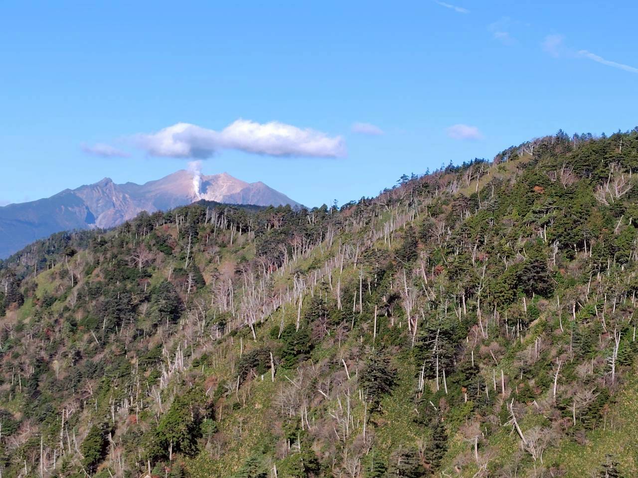 兜岩への登りで御嶽が見えます。一時噴煙が上がっていました。