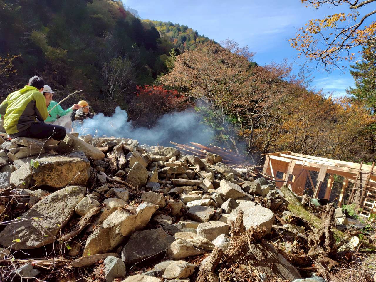 谷の途中で近年の土砂崩れで小屋が倒壊していました。解体工事が行われいました。