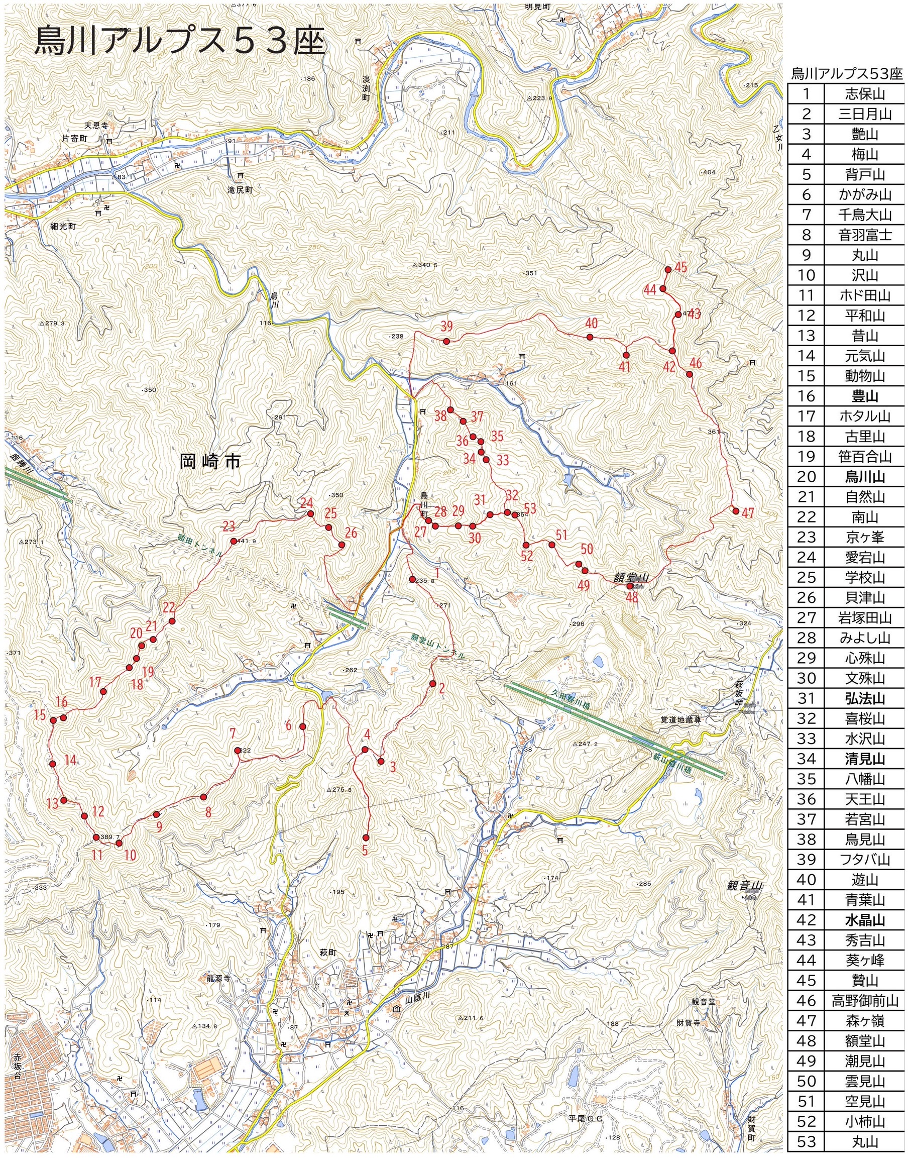 岡崎の鳥川アルプス周回コースで53座ピークの記録を見て山行計画しました。