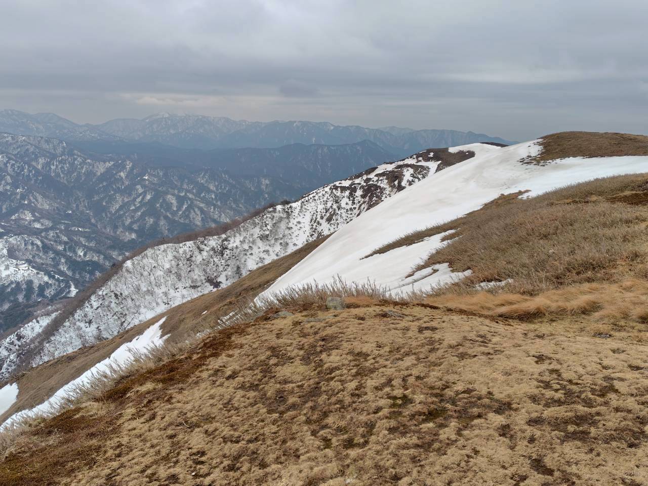 遠足尾根の合流点を過ぎた辺りからの頂上。雪が大分溶けて春先の残雪の感じ。少し残念です。気温もぽかぽかで10℃は確実に超えてる感じ。