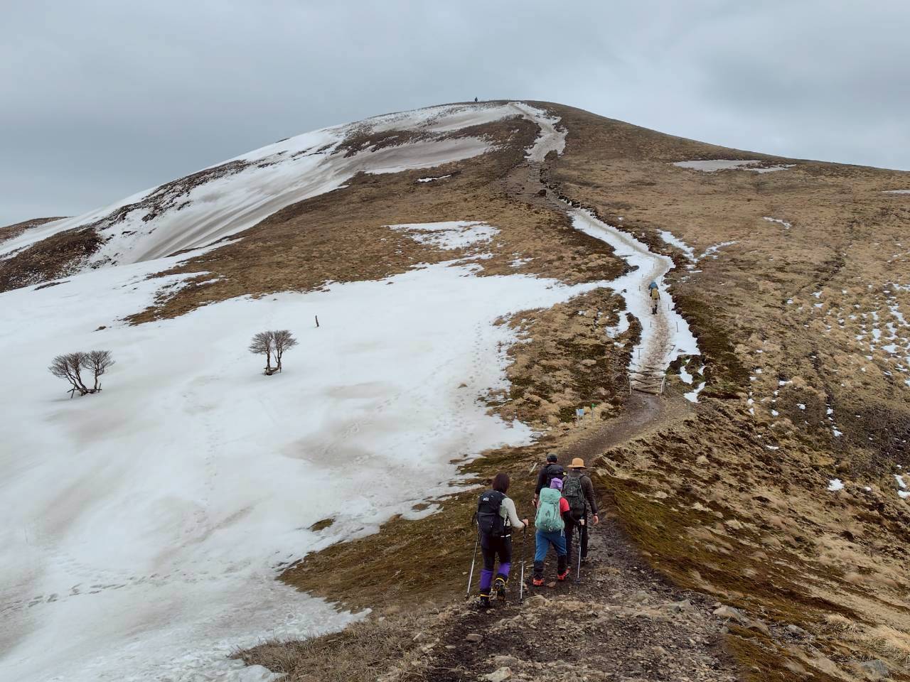 頂上への登り。雪が溶けてどろんこに(^_^;)斜面の立木はシロヤシオ。新雪がつけば白い羊、初夏の若葉と花の時期には若草色の羊さん、紅葉の時期には赤い羊を見る登山者で賑わう。