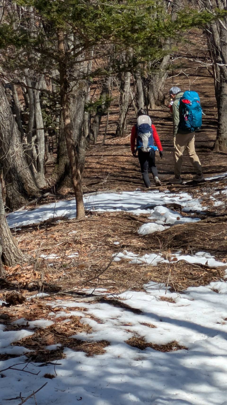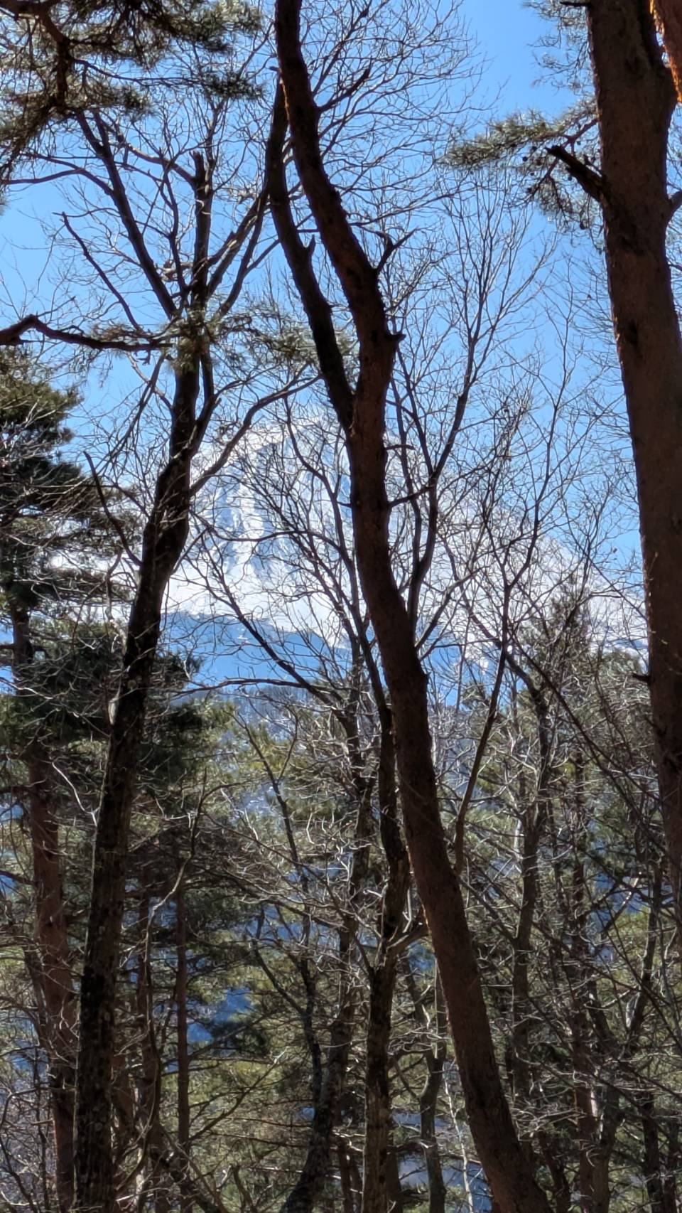落ち葉の溜まった登山道を尾根伝いに登って行くとミネ山に着く。振り返ると樹林の間から富士が見えだす。所々雪が残った尾根をぐんぐん高度を上げていく。