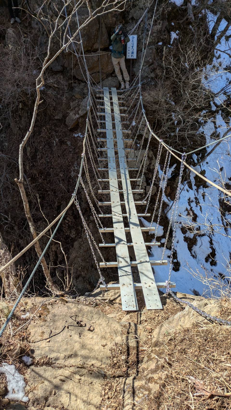それぞれのピークには看板があり、あと幾つと数えながら進むと十二ヶ岳手前の吊り橋が現れる。(ひとりずつ渡れ)の指導票があり指示に従う。意外と揺れるので女性陣は怖がっていた。