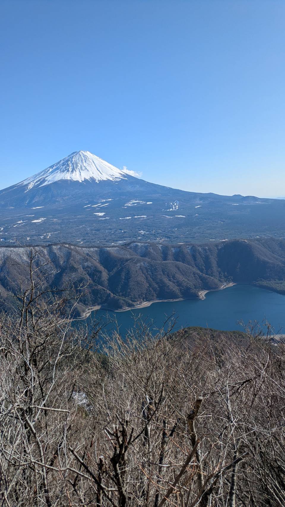小休止後十二ヶ岳へ向かう。稜線の風は予想より弱く小ピークを越えて行く。鎖場ありヒックスロープあり、おまけに雪が残っていて慎重に進む。常に左手に富士山、河口湖、西湖が見えて最高のロケーションである。