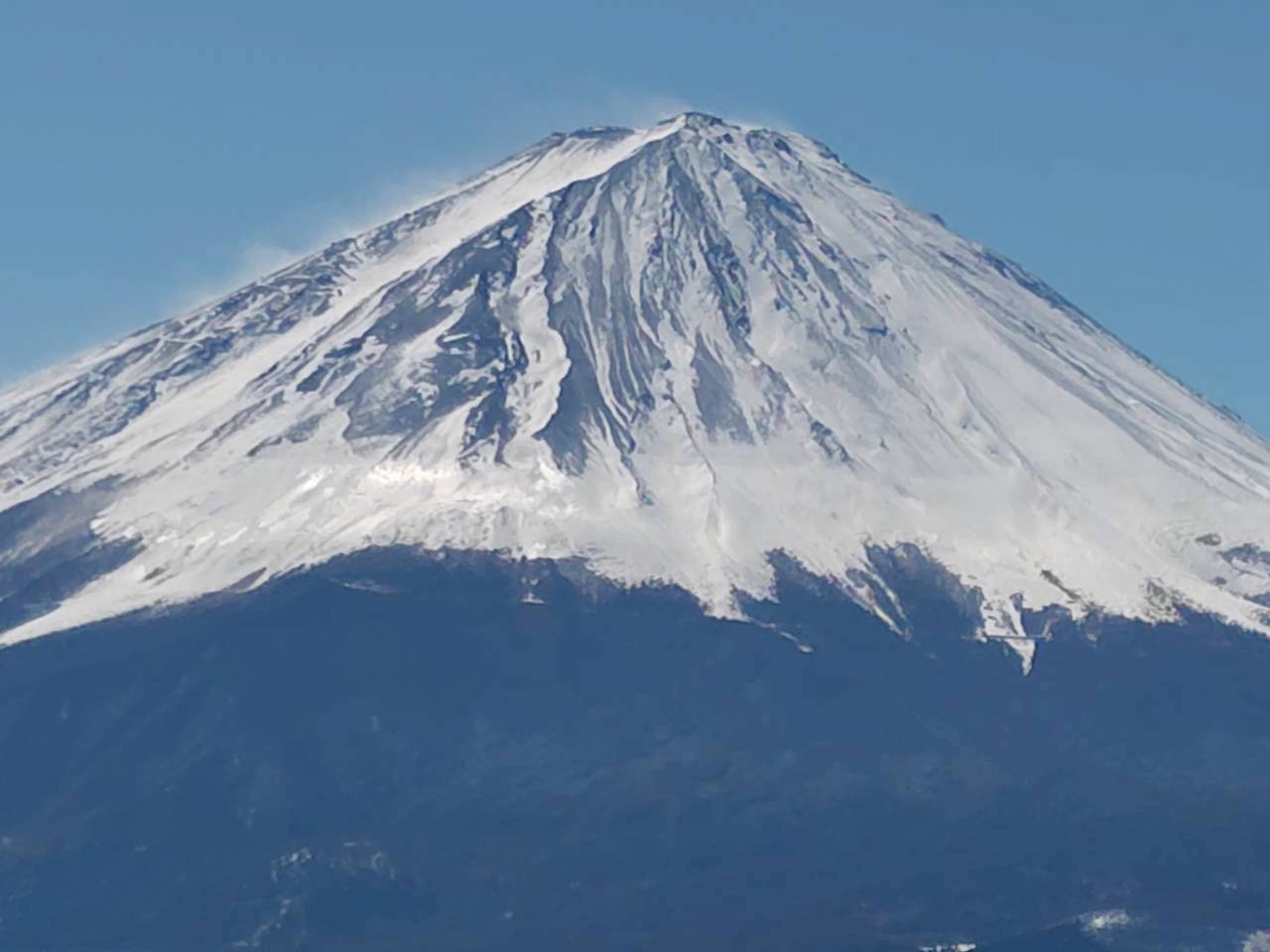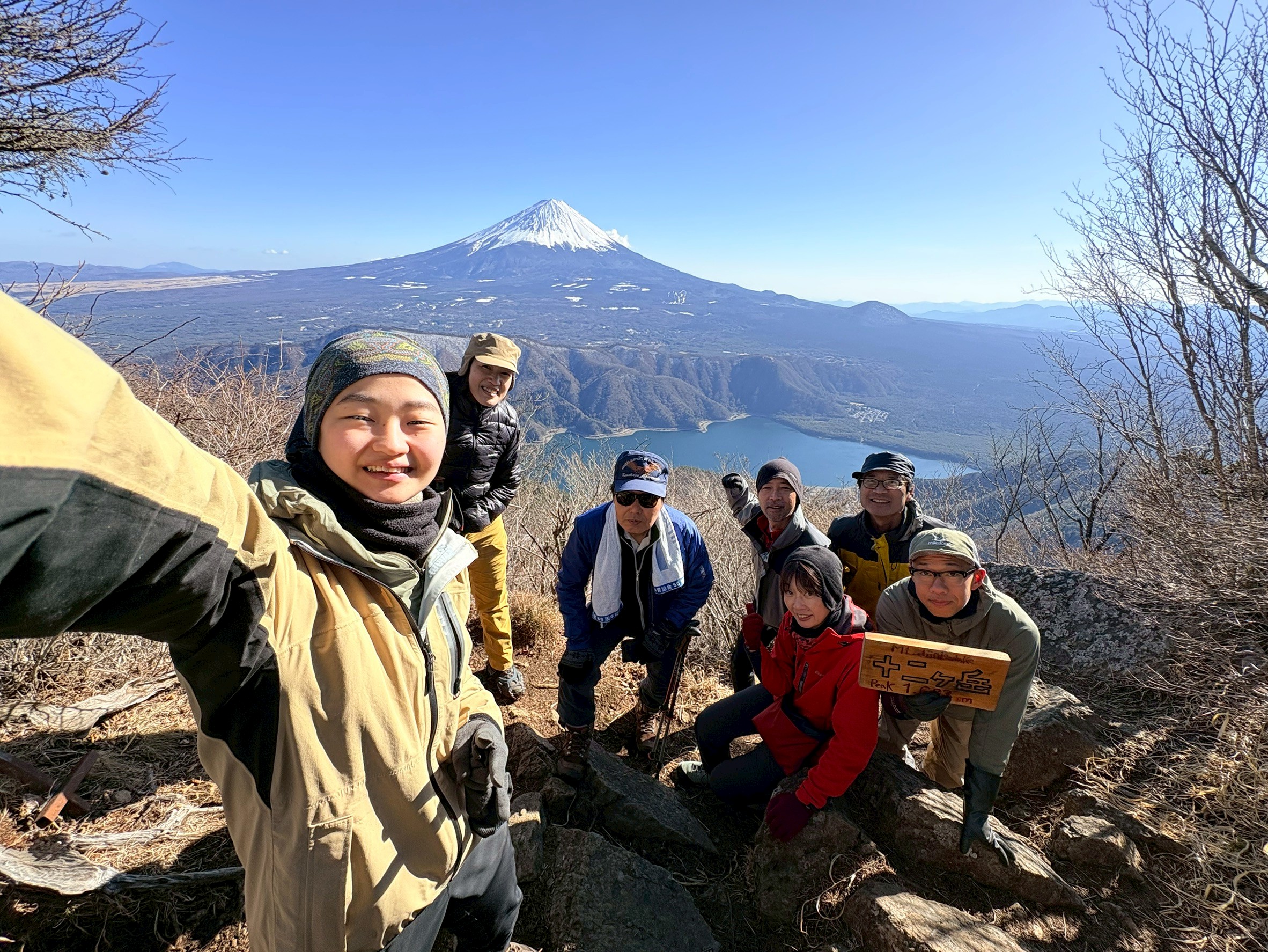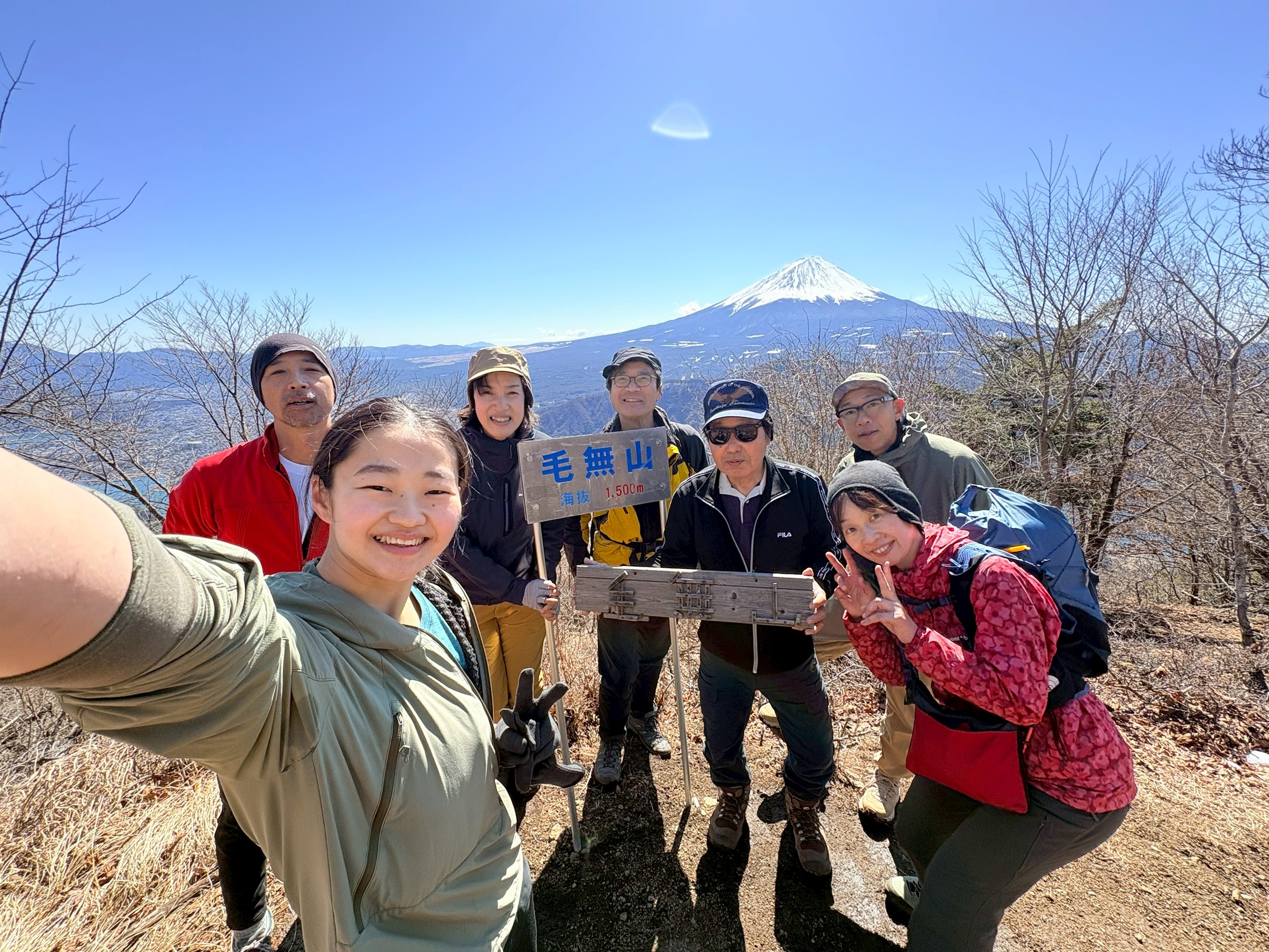 最後の急登を上ると毛無山山頂に着く。雪煙を上げる富士山が素晴らしい。皆それぞれにシャターを切り絶景に暫し酔う。
