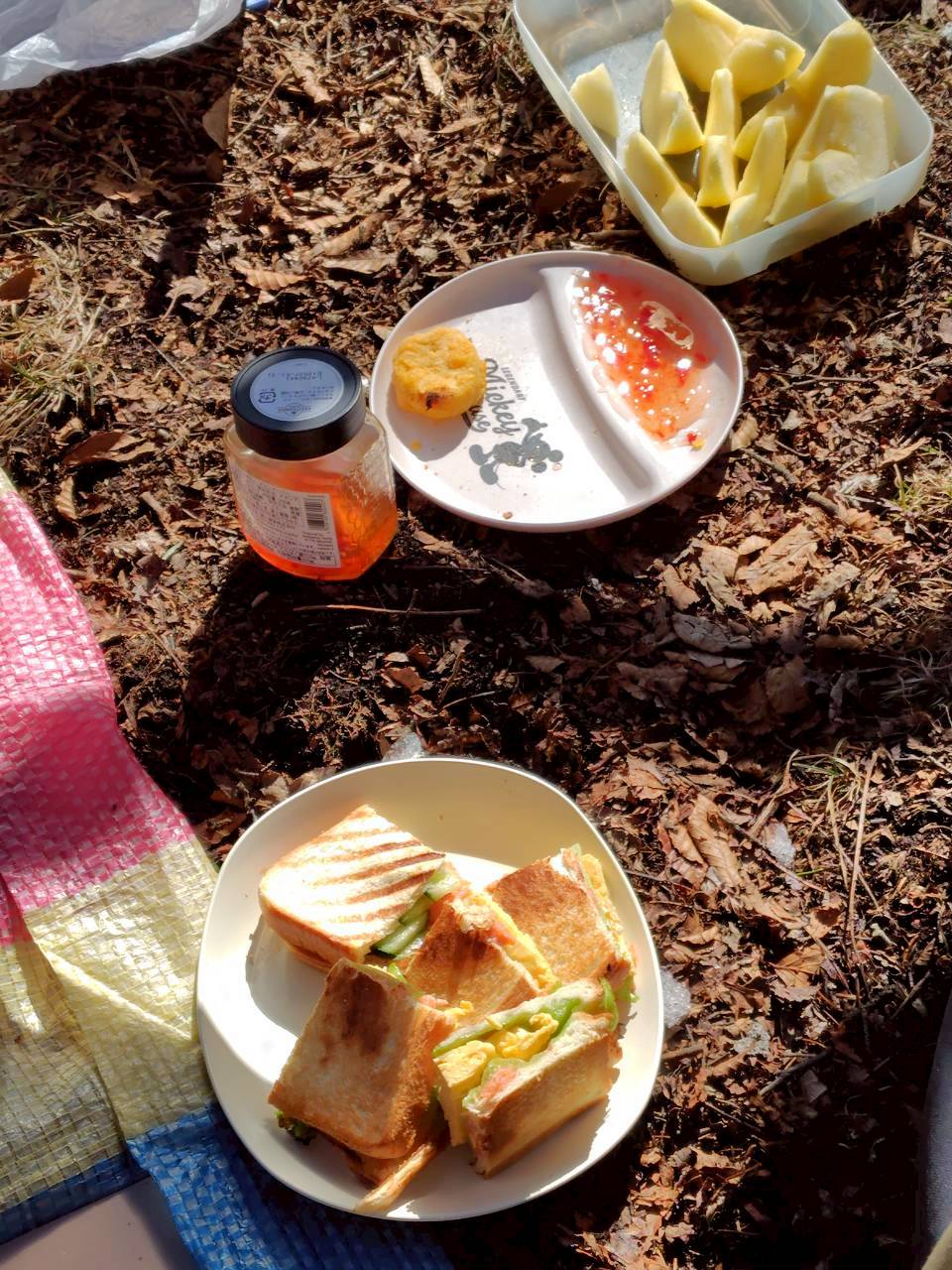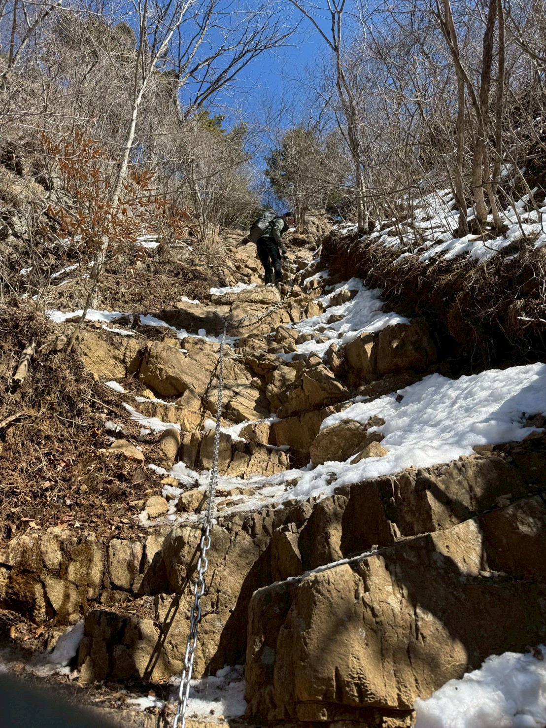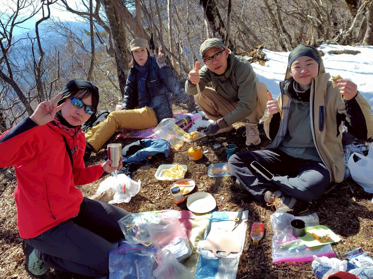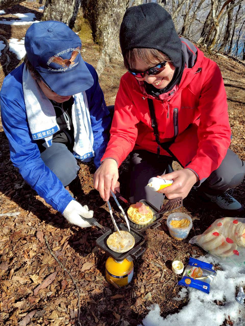渡り終えると山頂までの急登が待っていた。50m位か鎖がフィクスしてありぐんぐん高度を上げる。雪が凍っており滑りやすく慎重になる。西村さんはチェーンスパイクを付ける。下山道の分岐に着く。ここでお待ちかねのホットサンドを作る。日が当たって暖かくホットサンドを食べながら暫しまったりする。