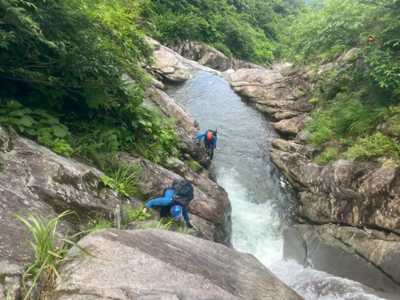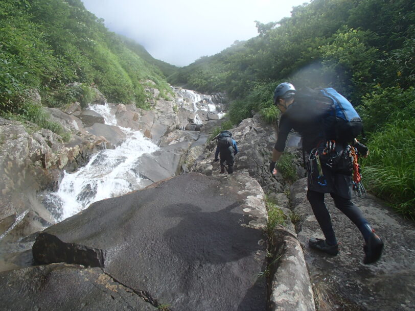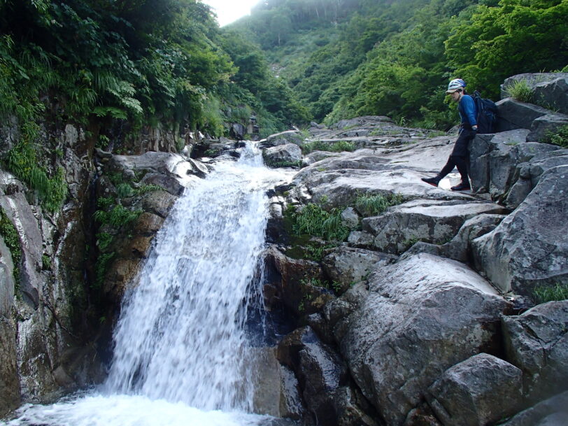 巻が終わると、あとはひたすら3級上ほどのナメ滝やトイ状の滝などをフリーでガンガン登って行く。