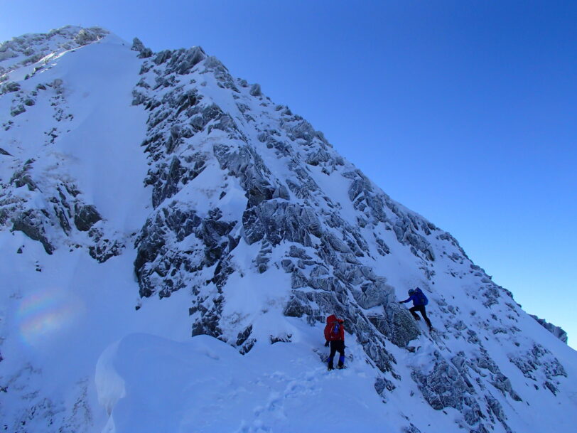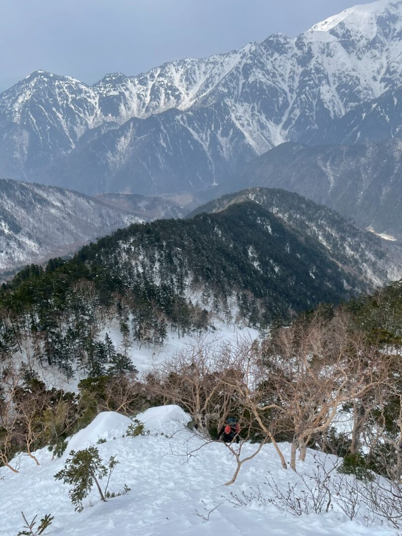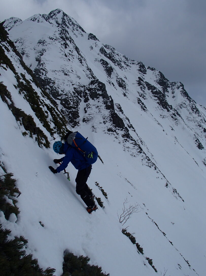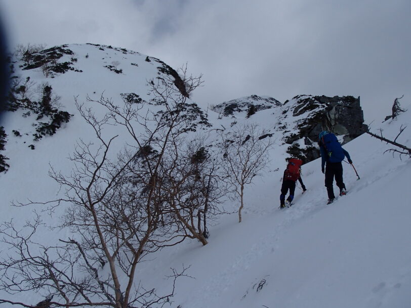 昨日もそうですが、トラバースが一番緊張します。雪が固かったり、ハイマツのせいで引っ掛からなかったり……。