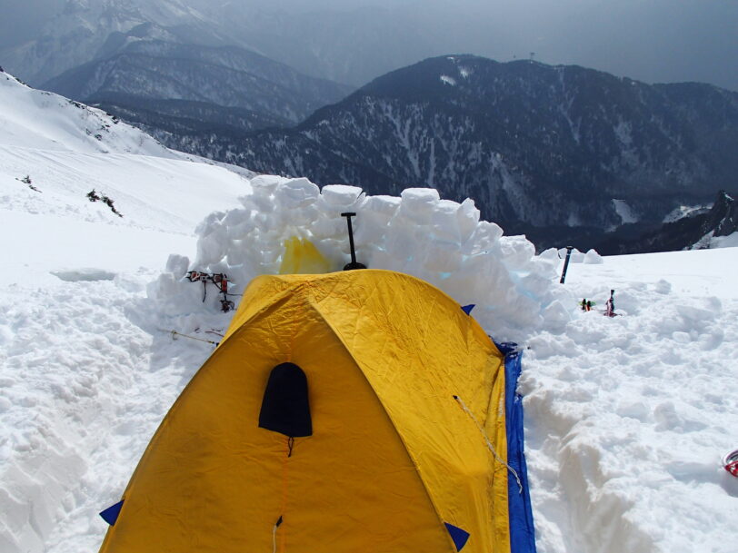 ジャンクションピークを越え、第二岩峰直下2700m付近のコルに設営。若者二人がスコップで整地しました。