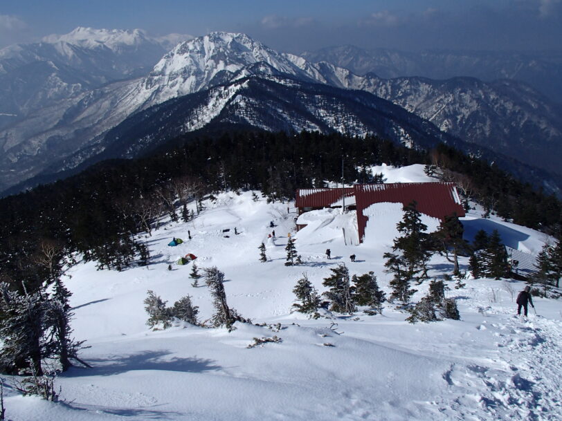山荘の方に下りていくと、ゾロゾロと一般登山者が登ってきます。アンザイレンしている人たちも多く、結構待ちます。