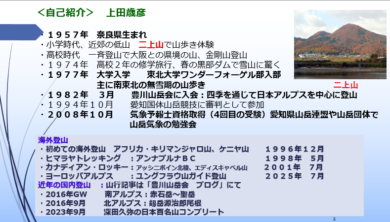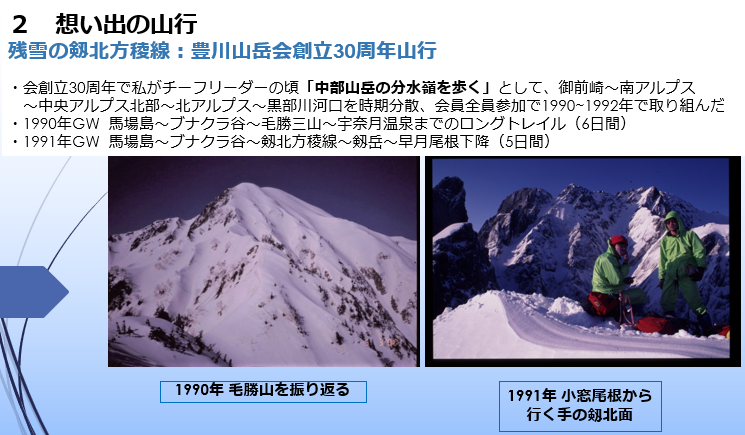 その後はこの3月に代表を退任する私(上田)から「私の想い出の登山」ということで話をさせてもらいました。