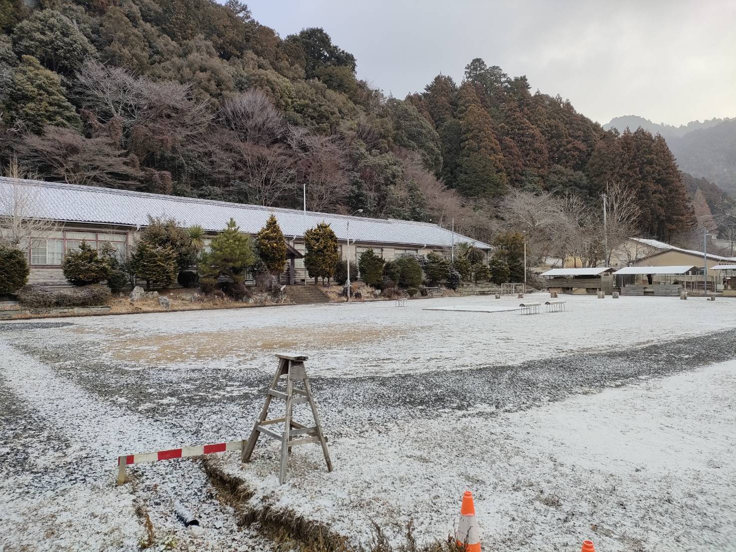 目が覚めると校庭はうっすら雪景色。